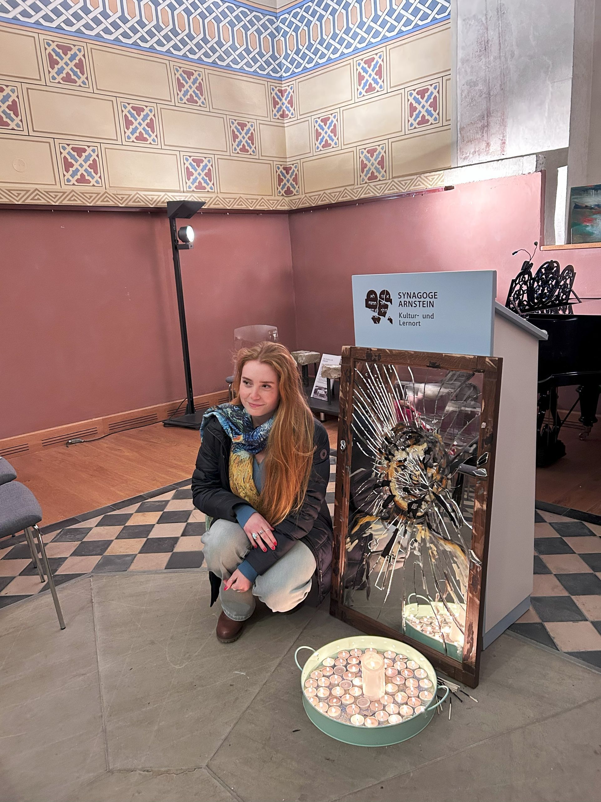 Meine Rolle war dabei die künstlerische Begleitung des Abends. Dafür habe ich zwei Werke angefertigt. Die Ladenstraße auf Leinwand mit dem Titel "Kristallnacht" sowie den Spiegel.