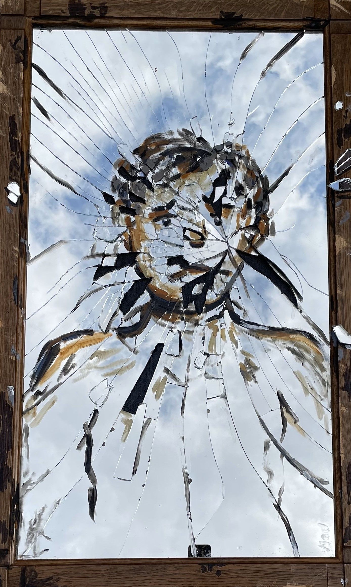 Den Spiegel habe ich bewusst zerstört, geraspelt, geschliffen, angezündet, bemalt und geklebt, um die Zerstörung symbolisch spürbar zu machen.