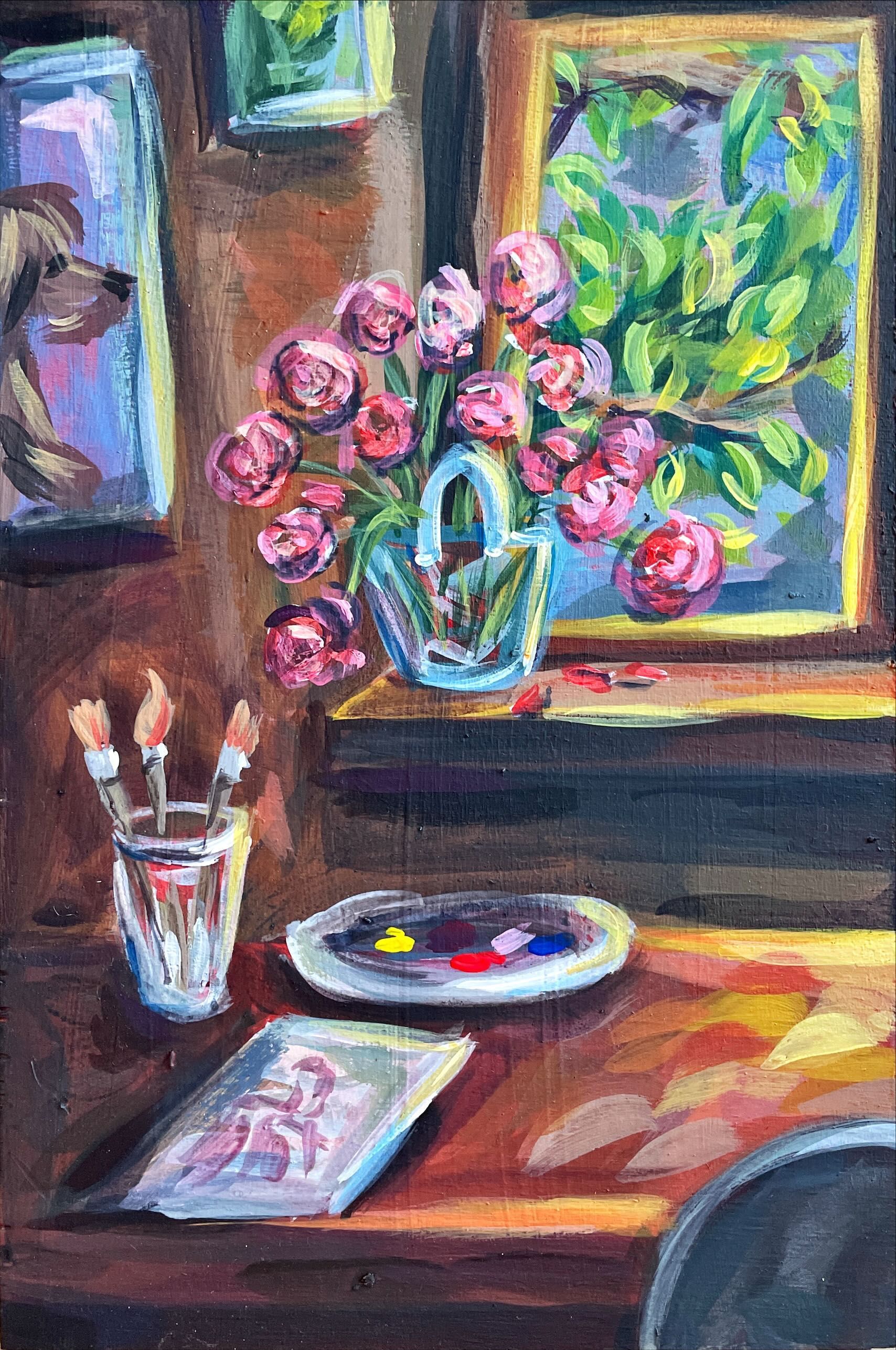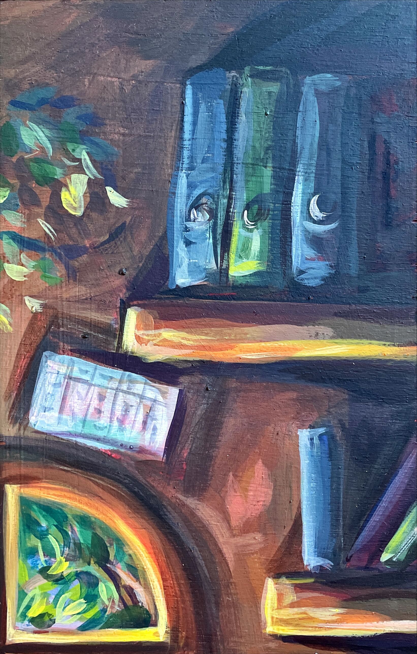 Nun zur Aufteilung des Bildes: das Motiv ist auf vier Holztafel angeordnet, wobei die linke und die rechte Seite verschiedene "Persönlichkeiten" beschreiben. Links der träumende Künstler, rechts das Lehramt und Universitäts Dasein. So entsteht die Eindruck bzw. die Frage, für welche der beiden Seiten sich heute entschieden wird. Der leere Stuhl lädt dabei zum eintauchen und entscheiden ein. Allerdings lassen sich wohl keine der beiden "Persönlichkeiten" klar trennen, denn das eine, kann nie ohne das andere. Kunst bedeutet Arbeit und die Arbeit wird zur Kunst.