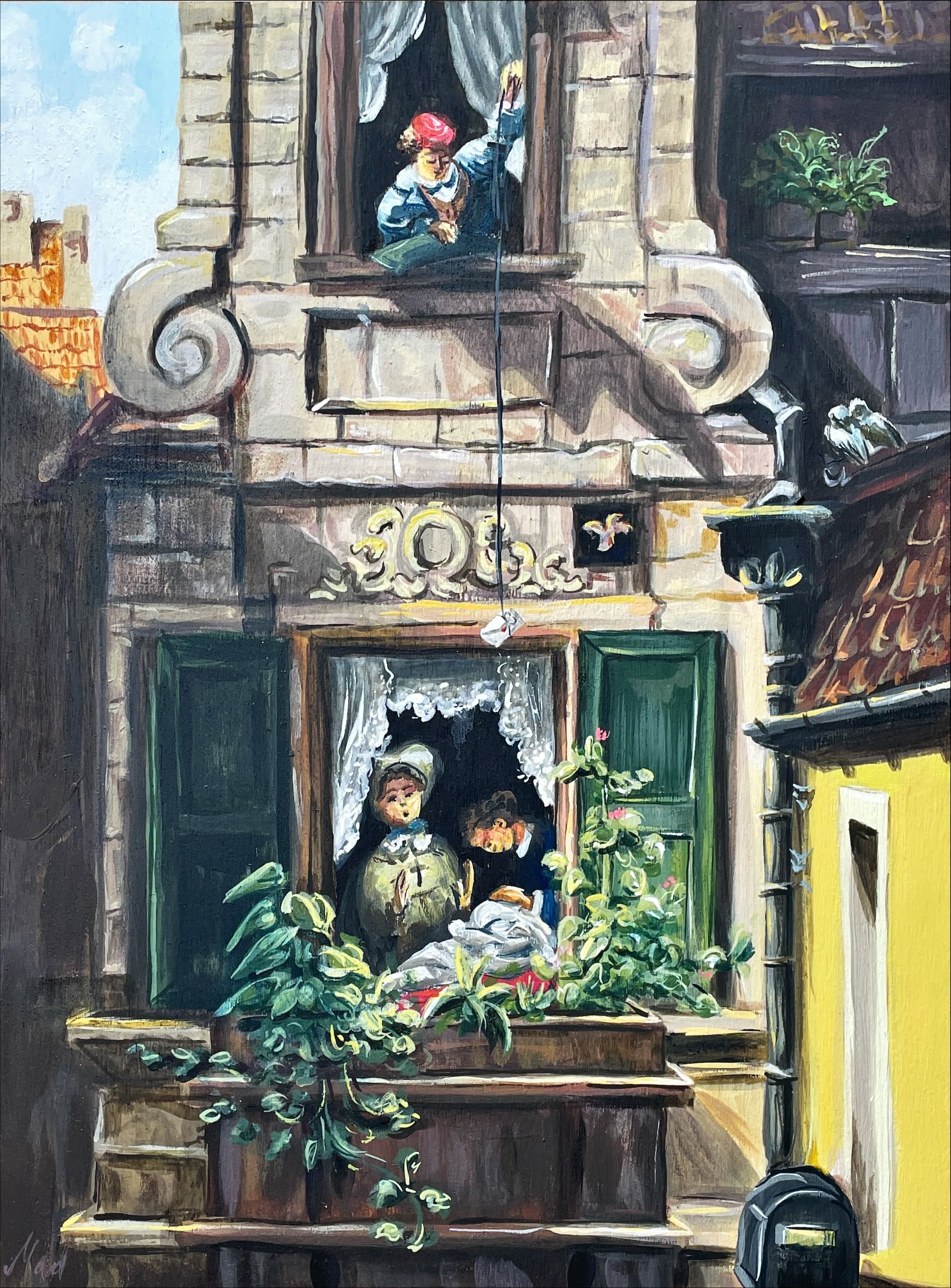 Meine neue Bilderserie - doch etwas ganz anderes als meine bisherigen Werke. Nicht nur die Motive haben sich verändert, auch mein Malstil hat sich weiterentwickelt. Aber beginnen wir vorne: Ich studiere nun Kunst im Hauptfach, das hat zur Folge, dass ich fast durchgängig künstlerisch aktiv bin. Sei es in einem Seminar, als Vor- oder Nacharbeit dafür oder für Tutorien wie das Aktzeichnen. Kunstaustellungen stehen öfter auf meinem Programm. Nicht zuletzt die Auststellung von Hans-Jürgen Schreckling - einem sehr begnadetem Maler! Von ihm wurde ich inspiriert, meinen Malstil auszubauen. Die Pinselstriche noch bewusster stehen lassen, die Farben leuchtender und zahlreicher. Das Ergebnis kann ich, wie ich finde, sehen lassen. Meine Intention ist schon immer das Ästhetische und Schöne. Das liegt natürlich im Auge des Betrachters, aber ich möchte Freude und Wohlbefinden bei den Betrachter auslösen. Die ganze Sache weitergedacht möchte ich sie auch zum schmunzeln oder sogar zum lachen bringen. Nichts ist dafür geeigneter als Komische Kunst . Für diese Bilderserie habe ich mich an Verwechslungen bedient. Die Bilderserie „Titeltausch“ ist zuerst einmal aus einem art-block (also der völligen Ideenlosigkeit) entstanden. Während eines Telefonats erzählt mir meine Freundin, sie würde ihre Lauchzwiebeln nun ins Wasser stellen, um Geld zu sparen. Der Gedankengang wurde bis zu Absurdität weitergesponnen, bis wir bei einem Bart aus Lauchzwiebeln angekommen waren. Aber viel witziger wäre doch ein Lauch mit Bart?? Gesagt, getan. Natürlich gehört dieses erste Werk ihr – als eine Hommage an ihren Lauch! Weitere Ideen und Vorschläge bekam ich durch intensives Brainstorming und diverse Umfragen auf social media. Ich war erstaunt, wie erfinderisch mein Umfeld ist! Somit stehen hinter vielen Bildern gleich zwei kreative Köpfe.